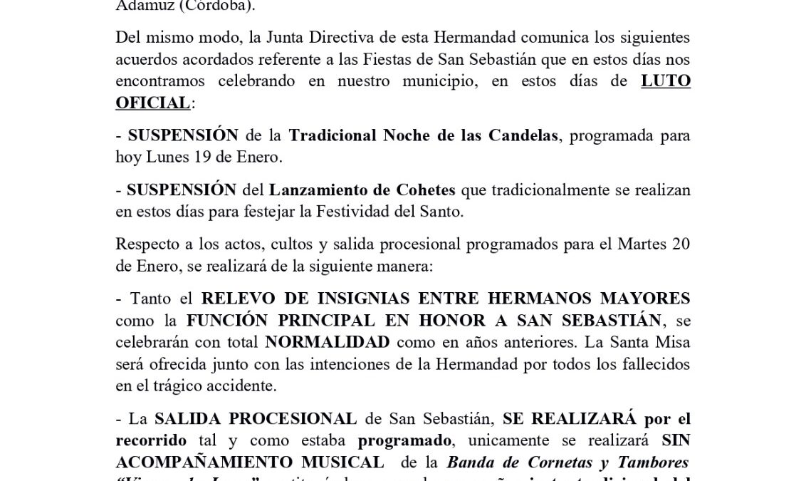 Tras el accidente ferroviario ocurrido en las inmediaciones de Adamuz y después de una larga reunión mantenido en Hermandad de San Sebastián en Villanueva de Córdoba, se ha decidido la suspensión de la Tradicional noche de las Candelas que se celebra este lunes, día 19, y del lanzamiento de cohetes, aunque mantiene todos los actos previstos para la jornada del Santo, el día 20, con el relevo de insignias, la Santa Misa que se ofrecerá por todos los fallecidos en el trágico accidente y la salida del Santo en procesión para finalizar con el convite de Hermandad.