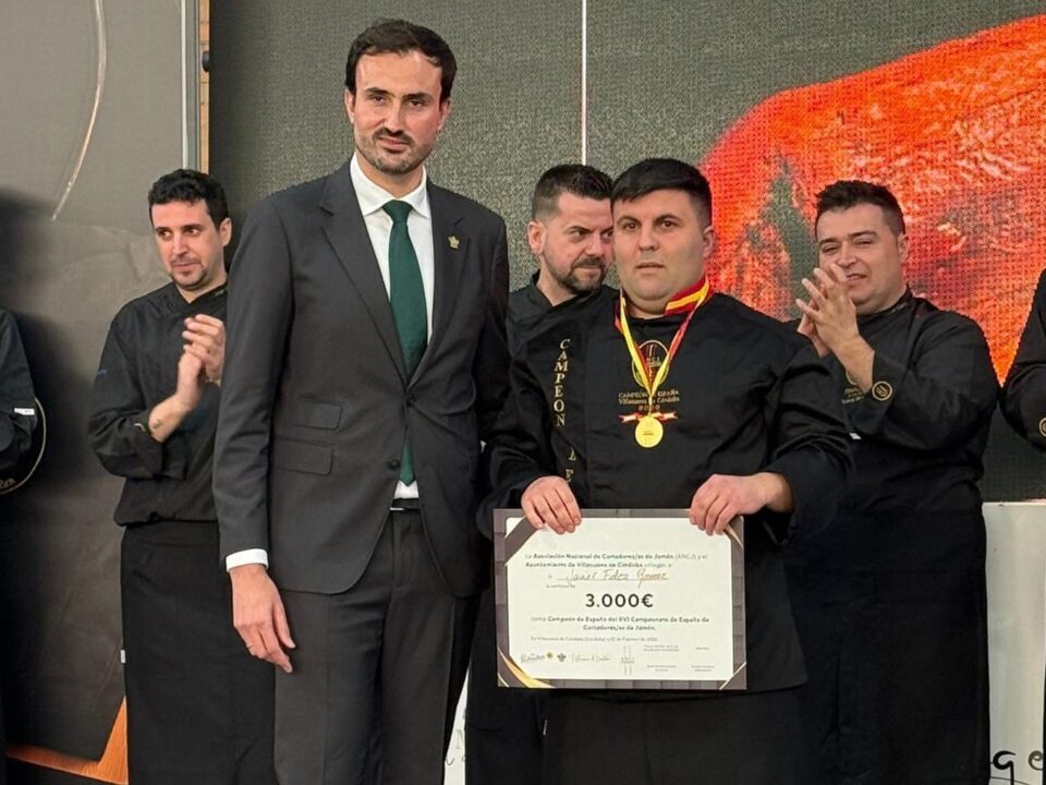 Javier Fernández, de Fuentes de León (Badajoz) se proclama campeón nacional de cortadores de jamón en Villanueva de Córdoba.